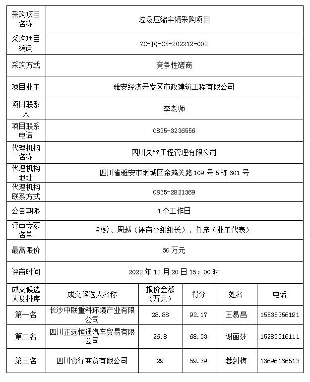 雅安经济开发区市政建筑工程有限公司垃圾压缩车辆采购项目成交公告